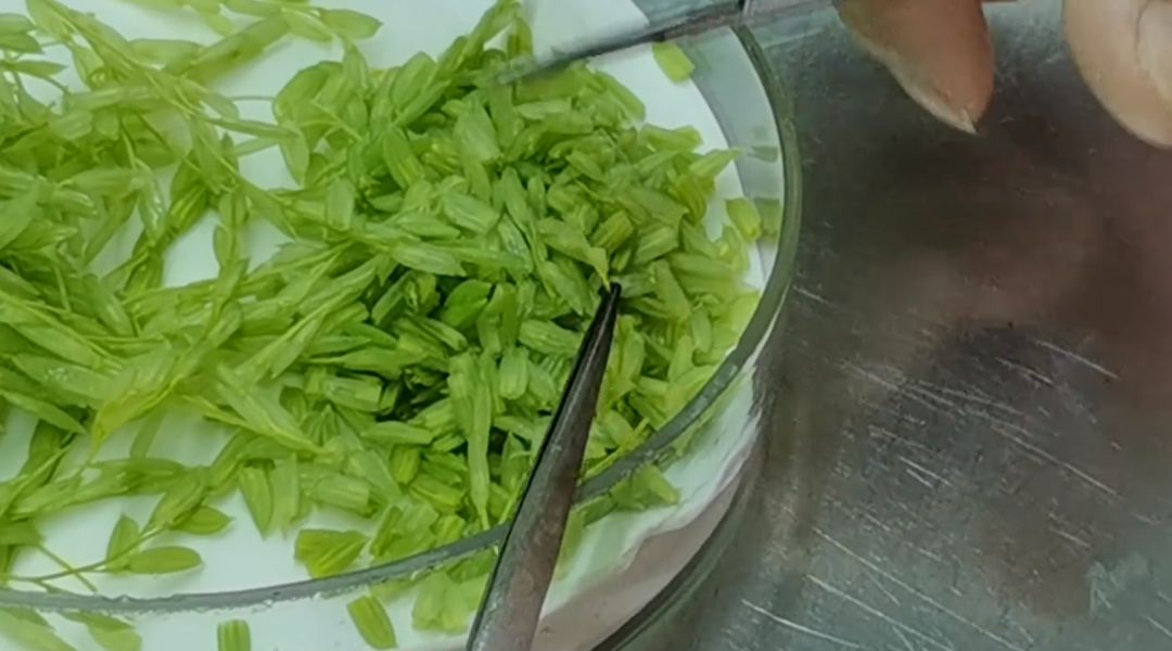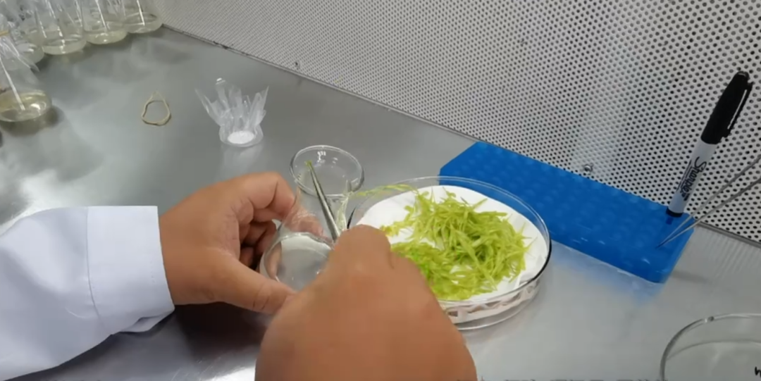 一個(gè)培養(yǎng)瓶里會(huì)投放50到100個(gè)花藥,隨著工作人員用鑷子在瓶口的每一次敲擊,一小節(jié)像頭發(fā)絲一樣彎曲的淡黃色花藥,被轉(zhuǎn)移到培養(yǎng)品瓶中,整個(gè)取樣過程,工作人員每天要敲擊瓶口上萬次。